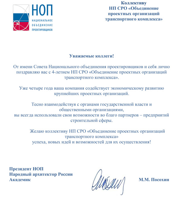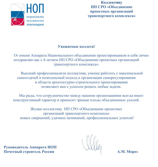 Национальное объединение проектировщиков поздравило НП СРО "ОПОТК" с 4-летием